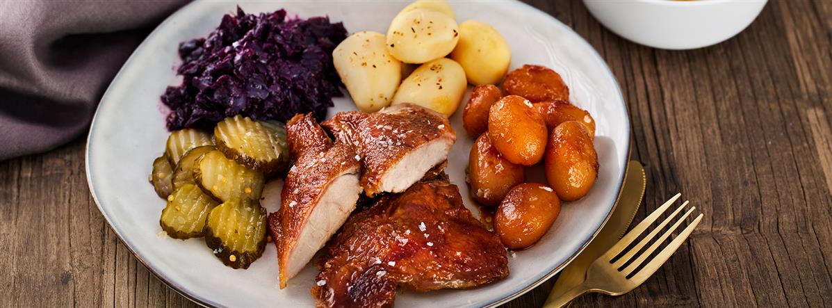 Briochebolle med confiteret and, coleslaw salat og syltede rødløg